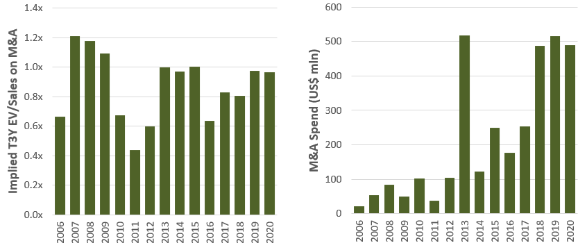 This is obviously the most interesting part of the story, and the place where I believe the range of future outcomes is widest. The best place to start is a look-back on what CSU has accomplished so far. The company reports revenue growth from M&A, and total M&A spend, which helps me back into an average EV/Sales multiples for all acquisitions in a year. Since 2006, CSU has increased M&A spend from $20 mln to >$500 mln, and yet the average transaction multiple has been more-or-less flat (albeit volatile). Given that margins at the corporate level have generally increased, it’s safe to conclude that they are not seeing diminishing marginal returns.