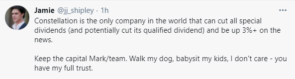 It’s worth noting that CSU recently announced their intention to axe special dividends as they pursue large VMS acquisitions and new initiatives. Mark clearly believes that CSU can deploy most of their FCF.