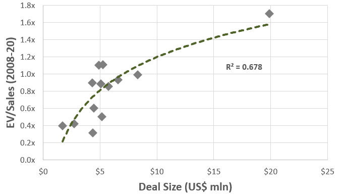 All else equal, as deal size gets larger, incremental ROIC falls (EV/Sales goes up). Exhibit G shows the historical relationship between deal size and acquisition multiple for CSU. I’ve anecdotally heard that acquisitions of VMS businesses over US$20 mln that are growing the top-line at mid-single-digits typically sell for 8-9x EBITDA (~2.0x Sales), which roughly lines up with the logarithmic relationship we see in Exhibit G. The Topicus acquisition was done at €217 mln, on 2020 revenue that probably works out to ~€115-120 mln, implying 1.8-1.9x Sales. There aren’t enough data points to know how strong this relationship truly is, but it’s a great starting point for understanding future returns.