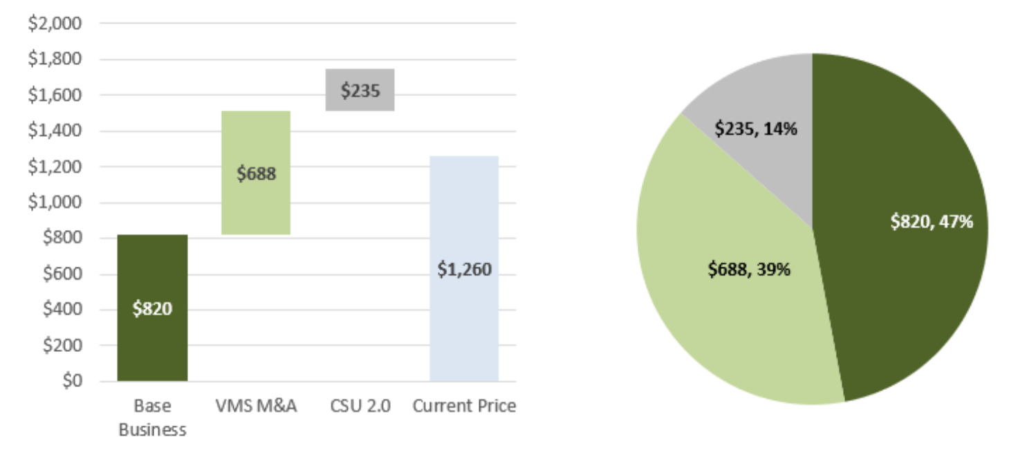 It’s helpful to think about the base case as the sum of three components: the existing business, value from VMS acquisitions, and value from CSU 2.0. Exhibit V splits this out. To value the base business, I took all VMS M&A to zero after 2021, and ignored the CSU 2.0 initiatives. I assume organic growth increases slightly to 2.5% from 2.0% because more human capital will be spent solving those problems. What I find particularly interesting is that the market doesn’t appear to be giving CSU any value for new initiatives, and is risking my VMS M&A assumptions by 40%. The implication is that the market isn’t pricing in large VMS M&A.