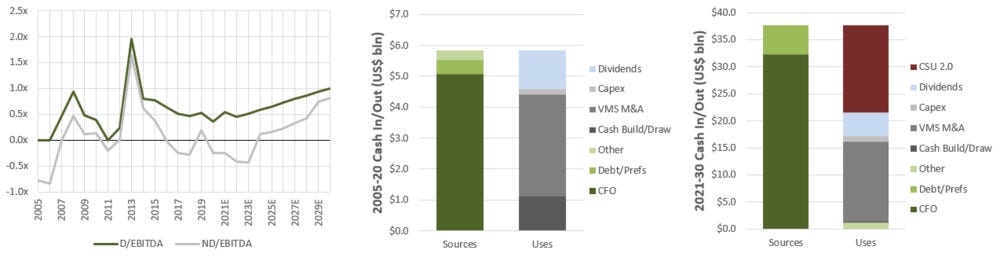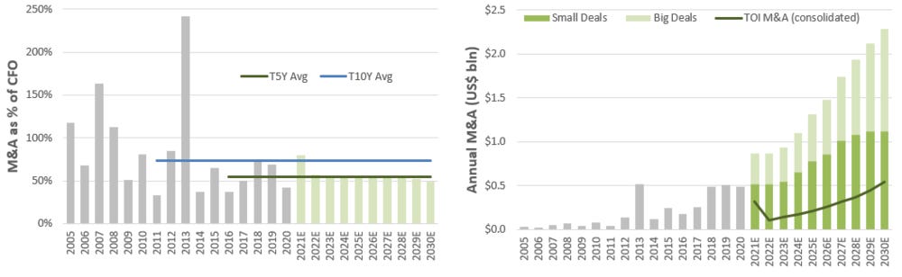 I start with the assumption that CSU can deploy 50% of CFO on VMS M&A through the forecast period. This is lower than the 10Y historical average but more-or-less in-line with last five years. Under this assumption, annual M&A exceeds $2.0 bln by 2030. To deploy this exponentially growing budget, CSU will have to pursue larger M&A. The underlying assumption in my forecast is that they can complete 1-2 large deals per year in the short-term (in-line with Mark’s objective), and 3-4 large deals per year by 2030. Even still, they will need to double the amount of small transactions they complete every year.