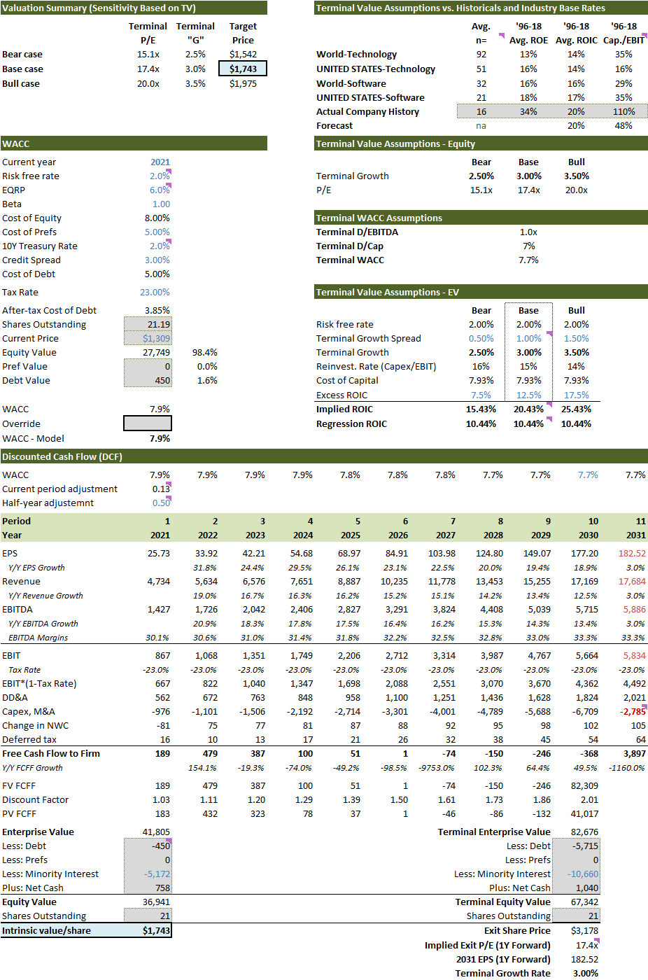 The DCF model shows that fair value in the base case is ~US$1,750/share (C$2,200), which is 30% higher than the current share price. A snapshot of the model is shown below. Another way to think about this is that a long-term investor could expect a 10% annual return in the base case.