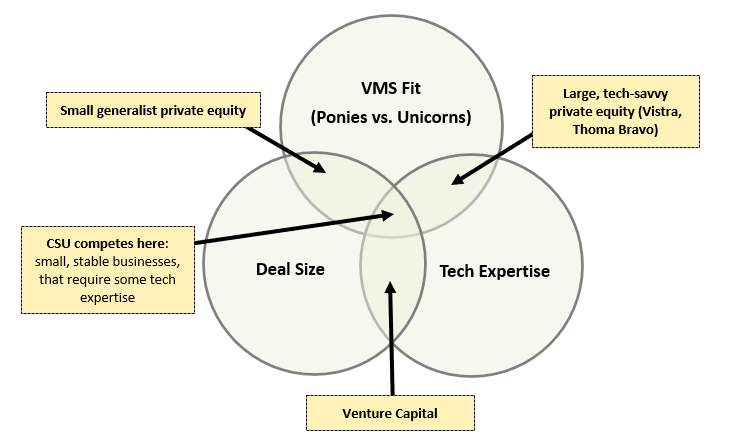 So, who competes to purchase ponies? One obvious group is private equity. Fortunately for CSU, a significant portion of all private equity AUM is managed by generalist firms without the depth of software expertise required to be successful in the VMS space, or to be attractive homes for VMS sellers. Most private equity firms also ultimately sell their portfolio companies and are not permanent homes for a VMS business, which isn’t appealing to many VMS sellers. There are some tech-focused private equity firms that may have long holding periods, but the best ones fall victim to their own success. A great early track record leads to AUM growth, and great firms like Vista Equity Partners and Thoma Bravo have grown AUM significantly over time. Combined, these two firms have completed ~750 acquisitions, and have around US$150 bln in assets. Average deal size today must be somewhere north of US$100 mln and growing. CSU’s average deal size is US$5 mln. One day, CSU might compete with these firms, but they certainly aren’t today. On the other end of the spectrum are small tech-focused private equity firms that might not have the scope, resources, access to talent, or reputation of CSU. These aren’t meaningful competitors either. The sweet spot is a miniscule corner of the universe that includes the likes of ESW Capital, who aren’t so big that they only chase large deals, but aren’t so small to be resource constrained. CSU estimates that there might only be a dozen or so tech-savvy private equity firms like this in North America who they consider to be meaningful competitors.