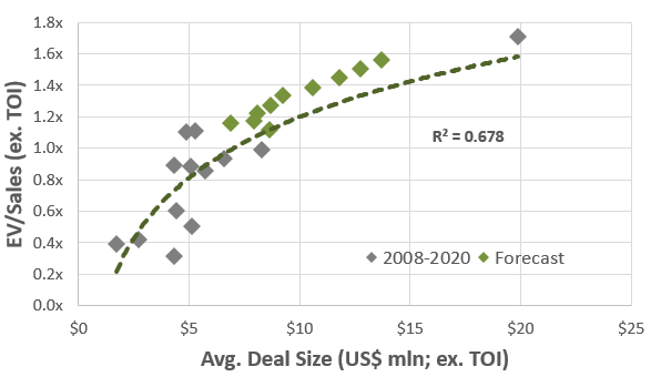 As I highlighted earlier, I believe CSU has a number of competitive advantages that have allowed them to decentralize M&A successfully. I don’t see any compelling reason that the company (ex. TOI) couldn’t execute 140 deals/year (up from ~70 in 2020 and ~85 in 2019). Nevertheless, deal size (even for small deals) is bound to increase significantly. Excluding TOI, I assume that average deal size grows by 2.5-3.0x. As deal size goes up, I expect that EV/Sales on acquisitions will also rise, which results in falling incremental ROIC.