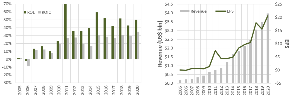 In the last ten years, CSU has grown Revenue and EPS at CAGRs of 23% and 42% respectively. Both ROIC and ROE exceeded 40% in 2019 and have increased substantially since the early 2000’s, despite the growing cash balance. Mark’s strategy – and execution of that strategy – is clearly working.