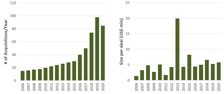 What’s more impressive is the absolute level of the EV/Sales multiple. I estimate that a 1.0x EV/Sales multiple is equivalent to a ~25% ROIC at the operating entity level. In my view, the primary reason CSU has been able to earn such a consistently high return on an exponentially growing M&A budget is that they’ve managed to keep average acquisition size small. Through a combination of management commentary, guesswork, and channel checks, I’ve managed to plot an estimate of historical acquisitions completed by CSU per year. From there I get an implied deal size, and Exhibit F shows that deal size has been more-or-less constant at ~$5 mln.
