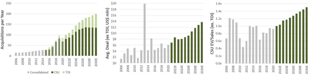 Without the scalable deal funnel, proprietary data sets, quantitative framework for allocating capital, and the education process, it is unlikely that CSU would have been successful at decentralizing M&A. I see no compelling reason that CSU couldn’t continue leveraging this structure to do 200 deals per year by 2030 (consolidated to include TOI).