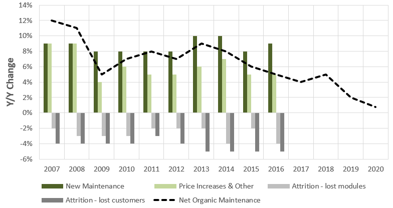 The other great thing about selling mission-critical software is that it is a need-to-have, not a nice-to-have. It is not discretionary spending. In 2009 and 2020, CSU realized organic growth of -3.0% and -2.6% respectively. Customer churn on Maintenance revenue in 2008/09 from Exhibit D didn’t even budge. It is truly remarkable that in two really challenging years for CSU customers, very few churned off.