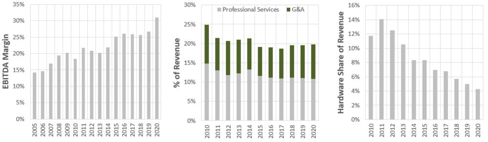CSU’s EBITDA margin has also steadily increased over time (Exhibit K). Under the decentralized model, very few expense lines benefit from scale, but Professional Services and G&A are the exception. You can find my linear regressions on each expense line in the model, or just take my word for it. If historical performance is any indication, CSU should continue to benefit from scale in these two categories. The other driver behind increasing EBITDA margins is that the contribution from Hardware sales has decreased significantly in the last decade (from 12% to 5%), and margins on hardware are lower than the rest of the business. This is another theme that’s likely to continue, and provide some support for margin expansion.