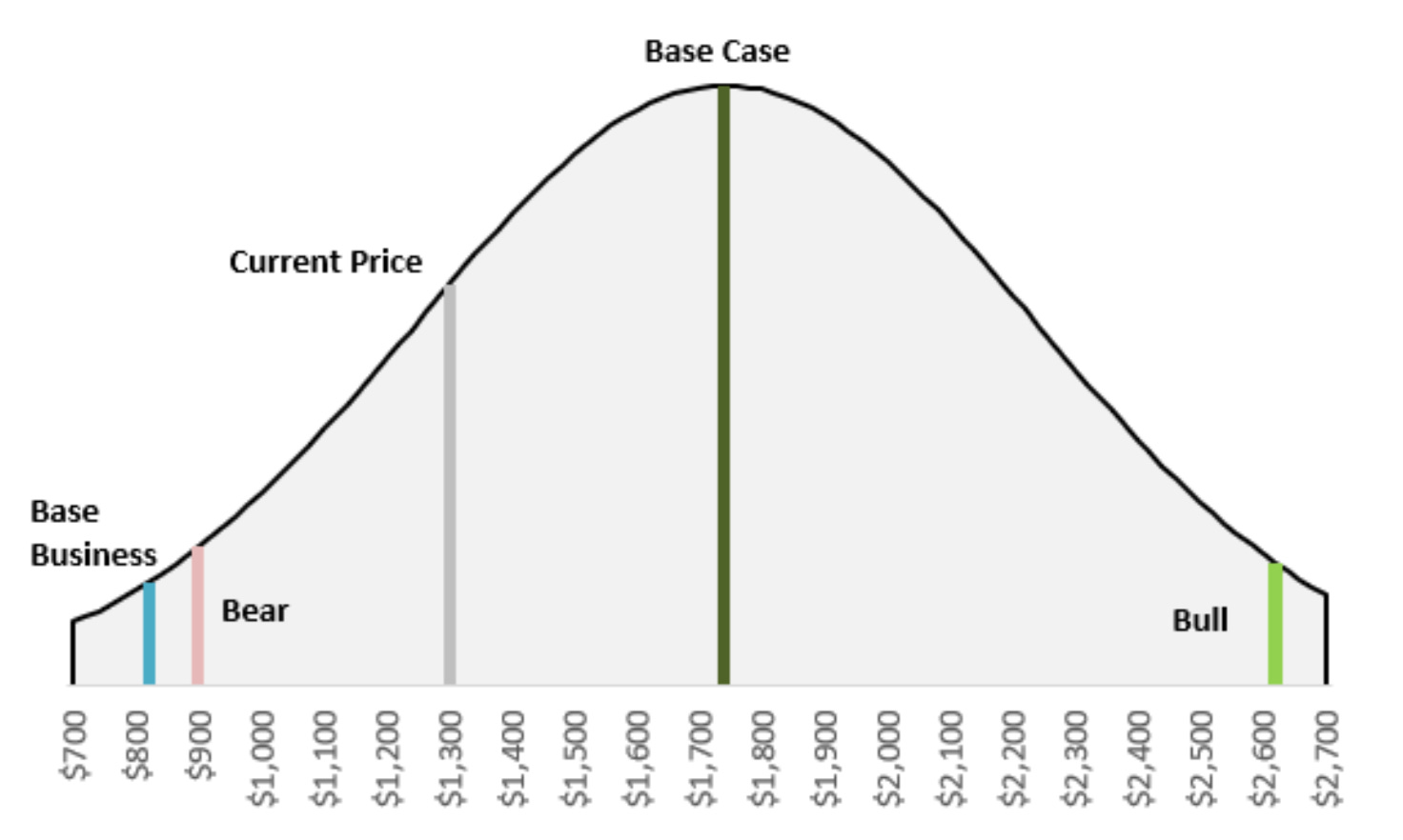 The base case isn’t particularly useful without understanding the range of outcomes. The bear and bull scenarios in Exhibit W are meant to represent something close to the 10th and 90th percentile outcomes.