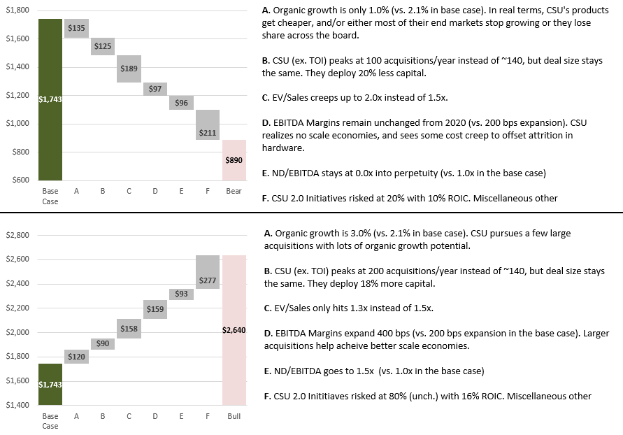 In one unlikely scenario, CSU could also create an asset management business and earn an attractive fee on AUM, which isn’t unprecedented. Even if the IRR in those funds was significantly less than what CSU earns today, it could still be a profitable new initiative. Thoma Bravo just raised $23 bln of equity commitments for a new round of funds, which could generate upwards of $1.0 bln per year in fee-based income. CSU could invest capital alongside fund investors (much like Brookfield), and target much larger deals. This seems unlikely, but I’ve seen multiple examples of this happening in other industries (like real estate and infrastructure). My bull case scenario would be much higher if they did this successfully.