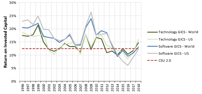 In these small saturated markets, the best way to generate above-average profit growth is to take share from competitors. I generally view Maintenance/Recurring revenue as the best barometer for the health of CSU’s existing businesses, and up until 2017, the company disclosed the four drivers behind Maintenance/Recurring organic growth (Exhibit D). Attrition from lost customers and lost modules is equivalent to customer churn, which has historically been 5-9%/year. Including price increases, we get gross dollar churn of just 0-4%. I tried to find industry benchmarks for churn rates, and although it’s dated, Clement Vouillon published a great Medium article that aggregated data from multiple sources. What I found is that CSU has lower customer and revenue churn than the average, which implies that they might be taking share from competitors. Adding back growth from new business, CSU ends up with Maintenance/Recurring organic growth rates in the ~mid single digits (2020 was obviously impacted by COVID). This organic growth requires little incremental capital, which results in increasing ROIC, even after we factor in attrition from License and Hardware revenue (since 2010, organic Maintenance/Recurring Revenue has increased by $454 mln/year, while total capital expenditures at CSU were just $157 mln).